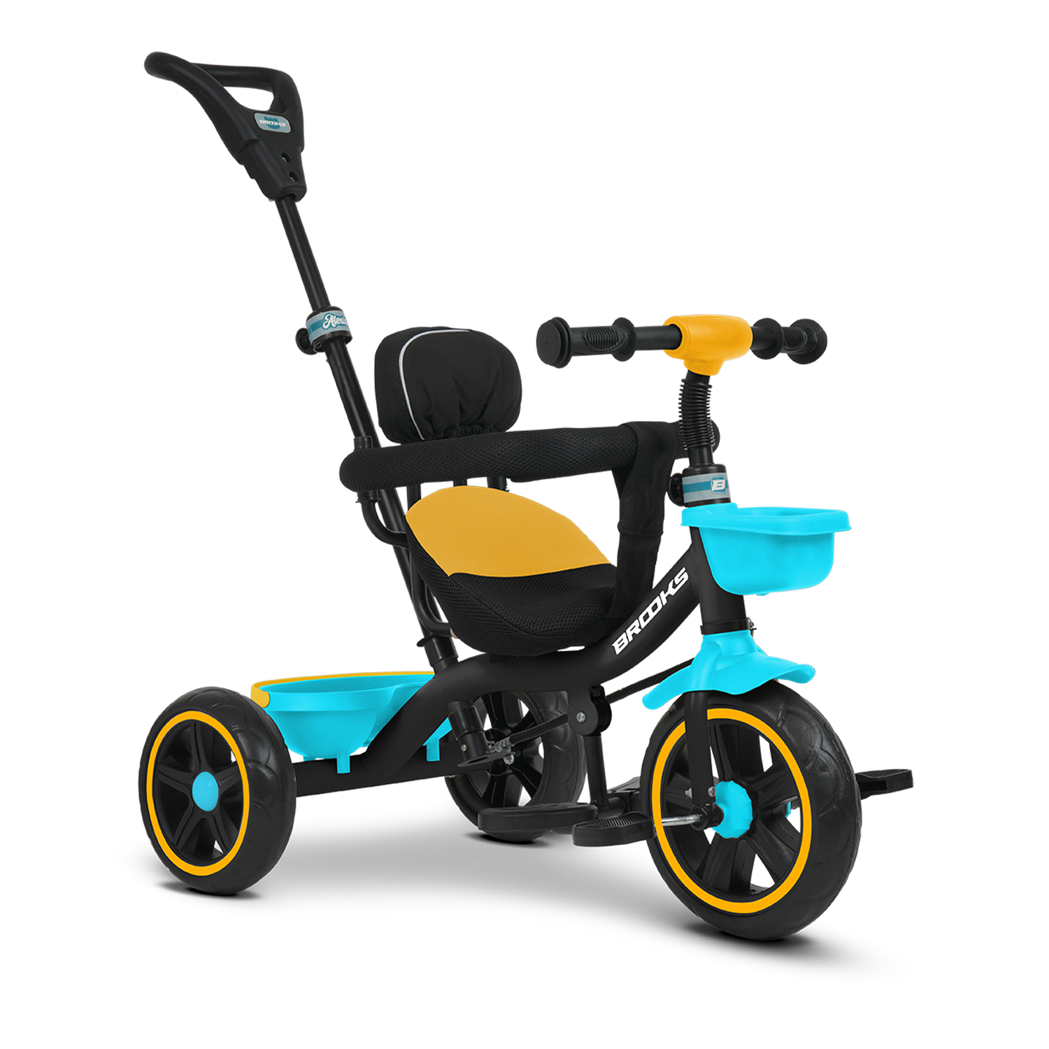 A high-back seat with safety harness ensures maximum comfort and protection, while the removable guardrail keeps your child secure during the ride. The front and rear baskets make room for toys and snacks, turning every outing into a fun-filled journey. Built with anti-slip pedals, durable EVA wheels, and a modern dual-tone finish, the Brooks Alexis EX combines functionality and design — perfect for both indoor and outdoor play.