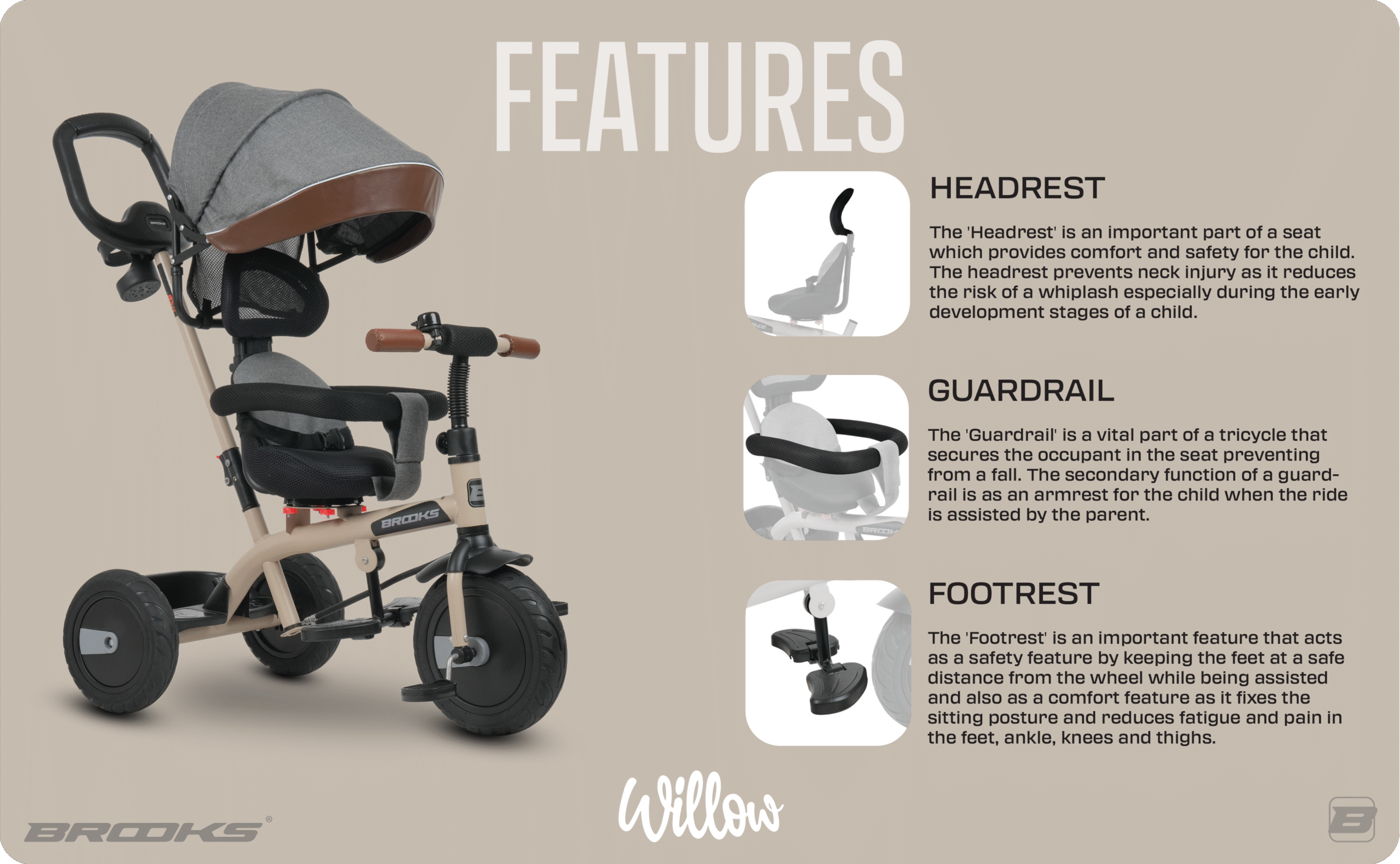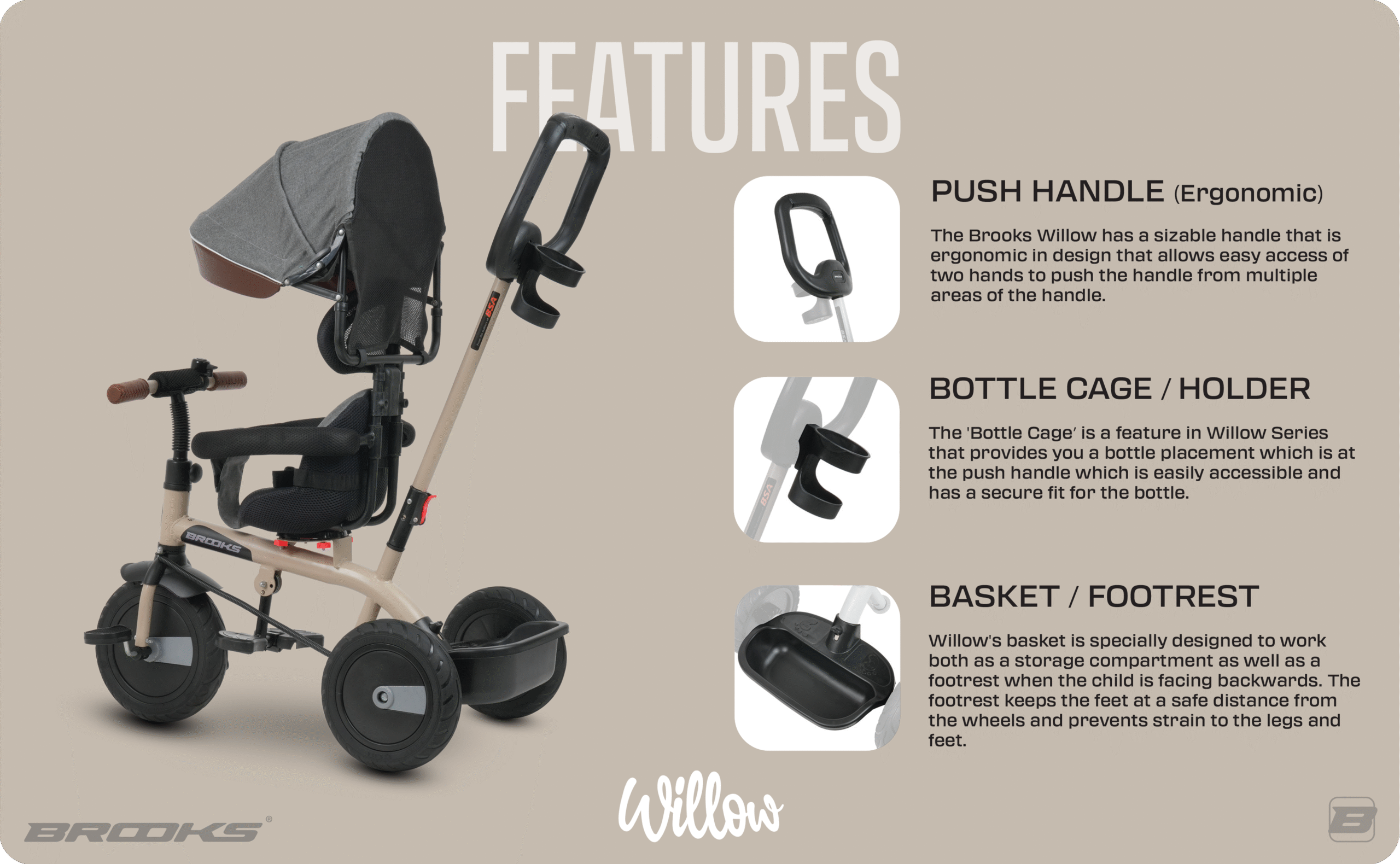A Harmonious Blend of Exquisite Craftsmanship and Practical Performance. Experience the difference of meticulously selected materials and a design philosophy that prioritizes both beauty and utility. The Willow tricycle boasts an elegant silhouette and robust construction, promising years of reliable use. Enjoy a smooth and comfortable ride, thanks to its ergonomic design and intuitive features, making every outing a truly enhanced experience.